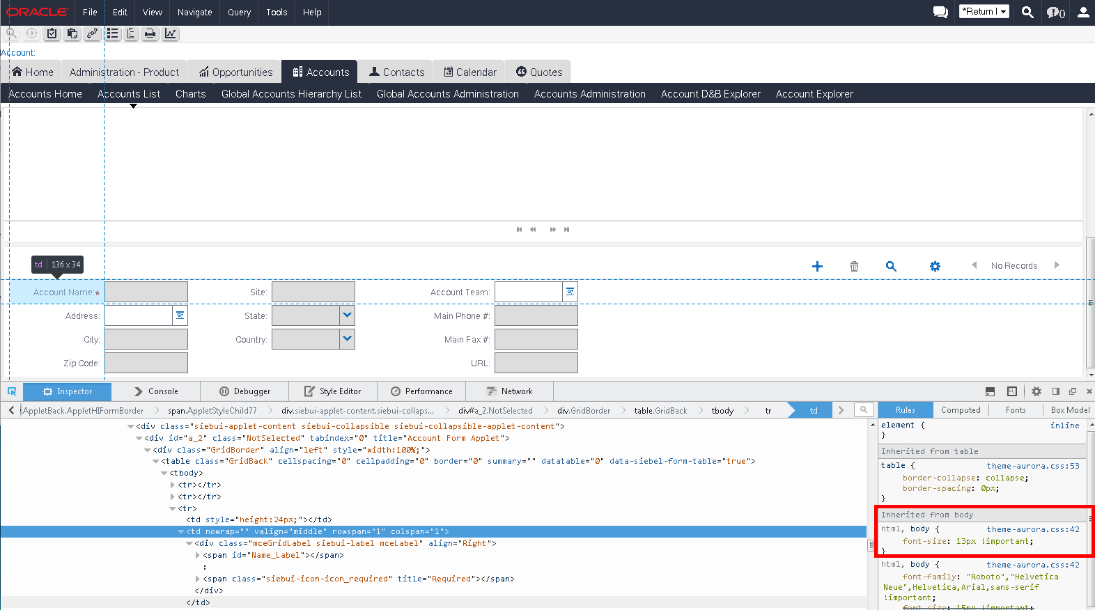 If you've had a chance to play with IP 2014 or seen screen shots, you might have noticed that the font size has increased from 10.8px in IP 2013 (0.9em of 12px) to 13px. We found that within our team, everyone had their own opinion on if this improved or hurt the look and feel of the new Siebel UI. However, we did find one negative effect of the larger font. On custom form applets where a lot of real estate had been used (i.e. the applet had many labels and controls), we found that the labels began to wrap because there simply wasn't the same amount of space available as their used to be. In our case, this label wrapping was undesired so it took some effort on our part to re-format the appearance of these applets. If you're moving to IP 2014 and have form applets crowded with many labels and controls, plan for the extra time that will be needed to re-format them.